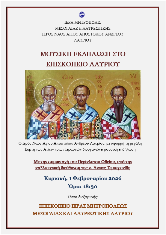 Με κάθε μεγαλοπρέπεια εορτάστηκαν τα Θεοφάνεια, την Τρίτη 6 Ιανουαρίου 2026 στην πόλη μας. Η Θεία Λειτουργία και ο Μεγάλος Αγιασμός πραγματοποιήθηκαν στον Ιερό Καθεδρικό Ναό Αγίας Παρασκευής Λαυρίου, Ιερουργούντος του Σεβασμιωτάτου Μητροπολίτου Μεσογαίας και Λαυρεωτικής κ.κ. Νικολάου μαζί με Ιερείς όλων των Ενοριών του Δήμου λαυρεωτικής. Ακολούθησε ο Αγιασμός των υδάτων και η κατάδυση του Τιμίου Σταυρού στο λιμάνι της Λαυρίου, αναβιώνοντας το γεγονός της Βάπτισης του Κυρίου στον Ιορδάνη Ποταμό, ψάλλοντας το «Εν Ιορδάνη» και πλήθος κολυμβητών να βουτά στα παγωμένα νερά της Λαυρεωτικής για να πιάσουν τον Τίμιο Σταυρό. Στην τελετή παρευρέθηκαν ο Δήμαρχος Λαυρεωτικής κ. Δημήτριος Λουκάς, εκπρόσωποι της πολιτειακής ηγεσίας, εκπρόσωποι των σωμάτων ασφαλείας και πλήθος κόσμου.