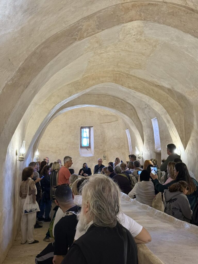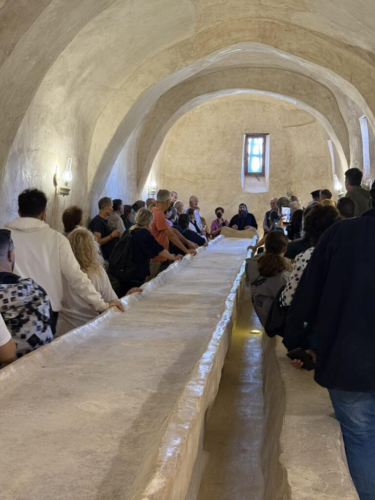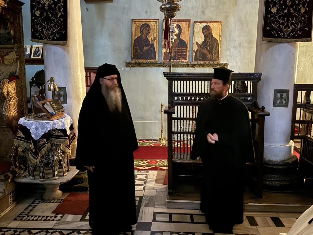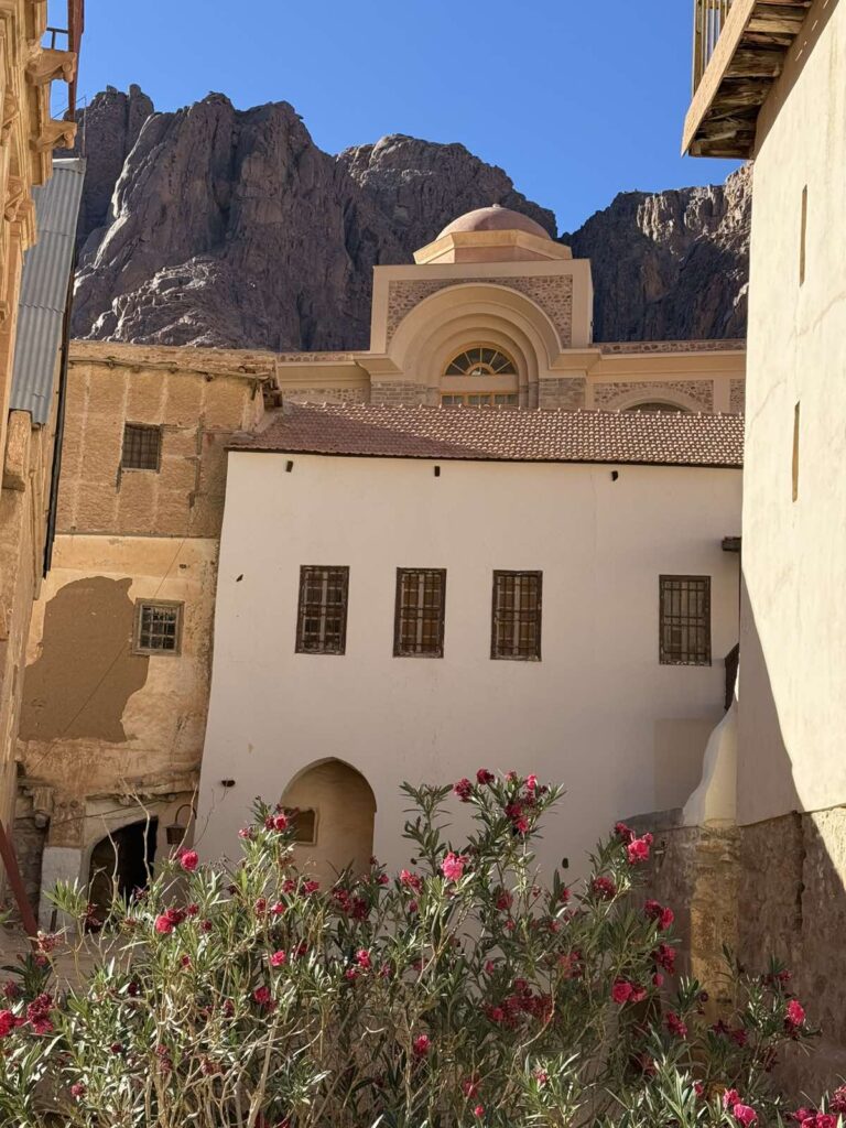 Στο Θεοβάδιστο Μοναστήρι φθάσαμε το μεσημέρι , αφού τακτοποιήσαμε τα δωμάτια, όλοι μαζί περάσαμε στον εσπερινό της Μονής και μάλιστα αφού προσκυνήσαμε, ο νεοεκλεγής Αρχιεπίσκοπος Σινά Φαράν & Ραίθον κ. Συμεών, μας καλωσόρισε στην Μονή προσφέροντας στους προσκυνητές ευλογίες του Αγίου Θεοβάδιστου Όρους Σινα.